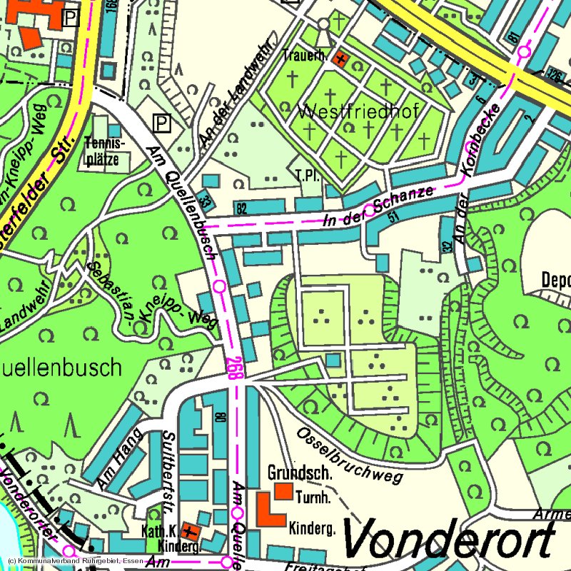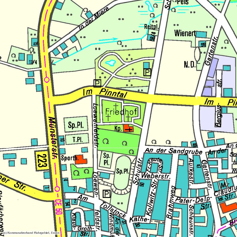 Im Pinntal, Münsterer Straße, In der Miere, Schulstraße Schulstraße, Käthe Kollwitz Straße (gedachte durchgezogene Linie bis zum Brahmweg), Brahmweg, An der Sandgrube An der Sandgrube, Gartenstraße, Im Pinntal, Schulstraße